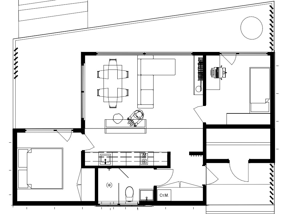 -2 спальни разнесенные в разных концах дома-санузел-просторная кухня гостиная с панорамным остеклением-две крытые террасы 30 м2